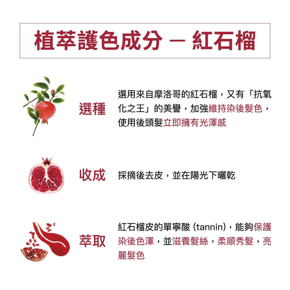 紅石榴護色亮澤,同步鞏固髮色色澤與持久度