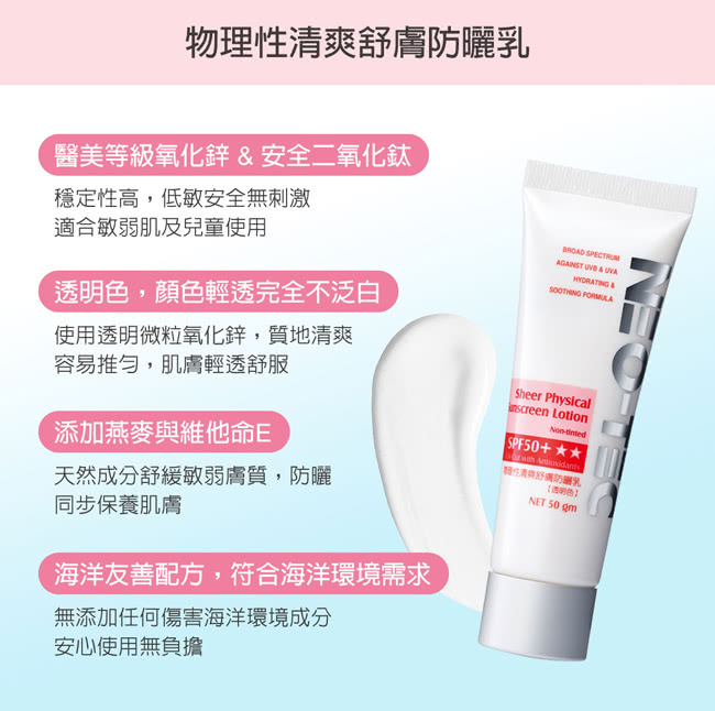 用途:SPF50***高係數物理性防曬霜,高效防禦紫外線,防止曬黑曬傷,全面減少光老化。搭配燕麥與維他命E,舒緩修復曬後肌膚。採用天然礦彩,自然美膚效果,新配方好推勻膚色更自然,海洋友善配方,全膚質皆適用。